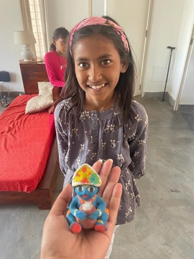 Gitanjali gave me an interesting perspective! She said Vaishnavi is very young, at this age, we should allow her creativity to blossom without putting her into the boundaries of learnt art. Let her fly with her imagination first, skills are easy to build later. Before we know, she will be exposed to other artists which will anyway “colour” her innocent splashes. This is her only chance at experiencing free art.